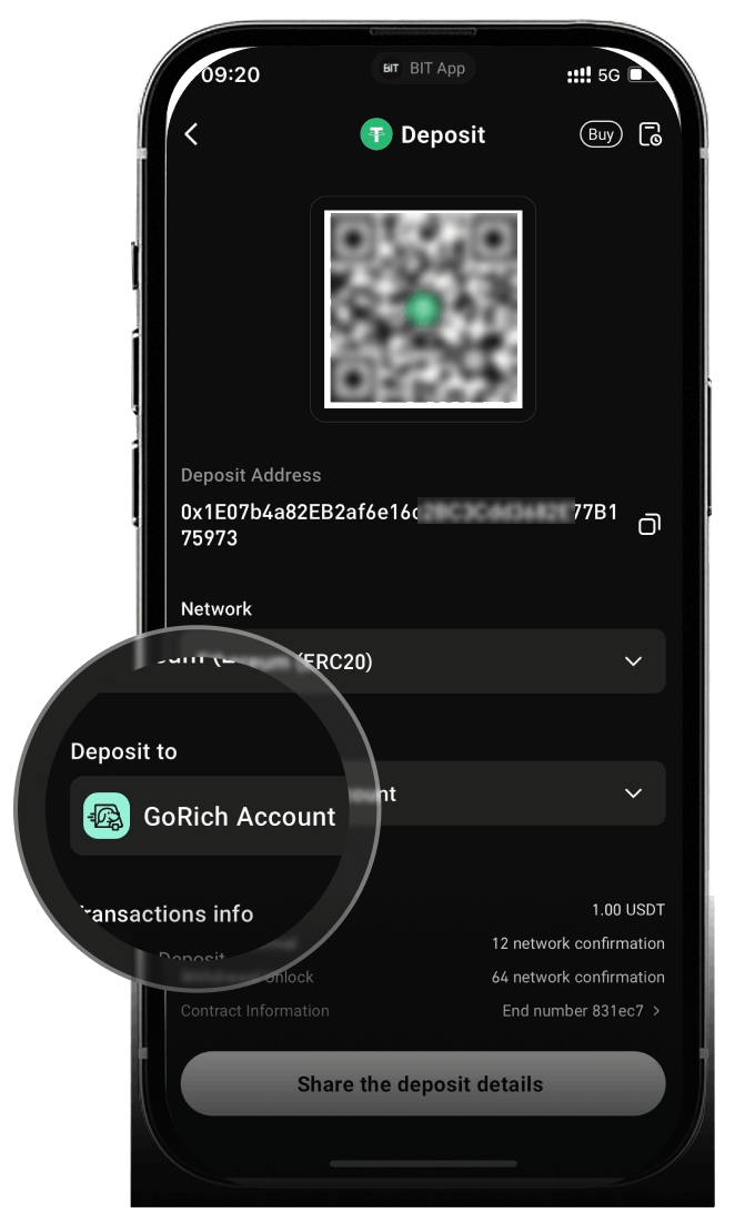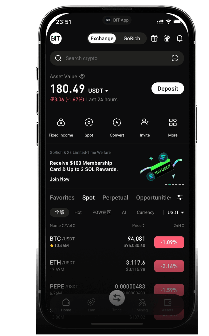 GoRich 홈페이지 또는 [자산] 페이지에서 [입금] 또는 [송금]을 선택하세요.입금: 지원되는 자산(BNB, ETH, SOL, USD, USDT)으로 GoRich 계좌에 직접 입금하세요.송금: Bit.com 입금 계좌에서 GoRich 계좌로 자금을 이동하세요.자금 이체 가이드